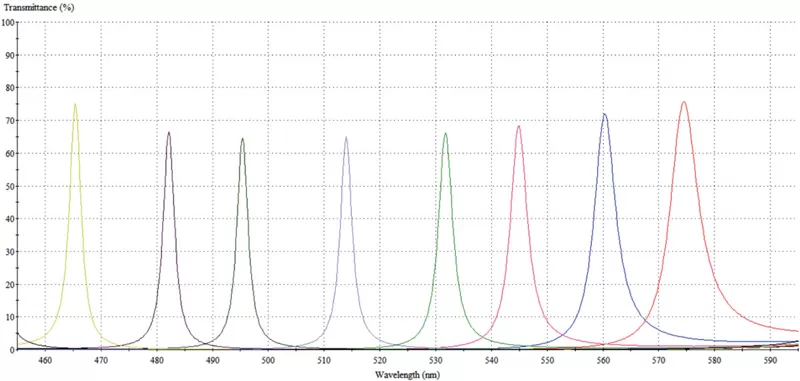 Длина волны (нм) | Пиковое пропускание (%) | CWL | Количество спектральных каналов | Размер одного канала (мкм) | Измерение (мм) | Примечание |
